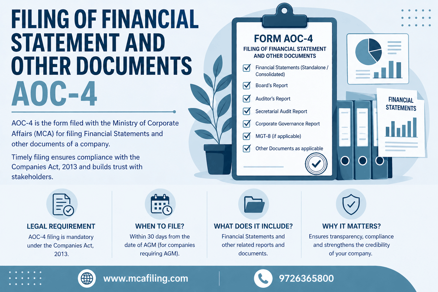 Are you looking for Filing of Financial Statement and Other Docs (AOC-4)? Every company registered under the Companies Act, 2013 is required to file its annual financial statements with the ROC through Form AOC-4 on the MCA portal. This form includes key financial documents such as the balance sheet, profit and loss account, auditor’s report, and other required attachments. Filing AOC-4 ensures your company’s financial details are officially recorded with the government and keeps your business legally compliant. Timely submission is important to avoid additional ROC fees, heavy penalties, and future compliance issues. Proper AOC-4 filing also helps maintain your company’s active status and builds trust with banks, investors, and other authorities.